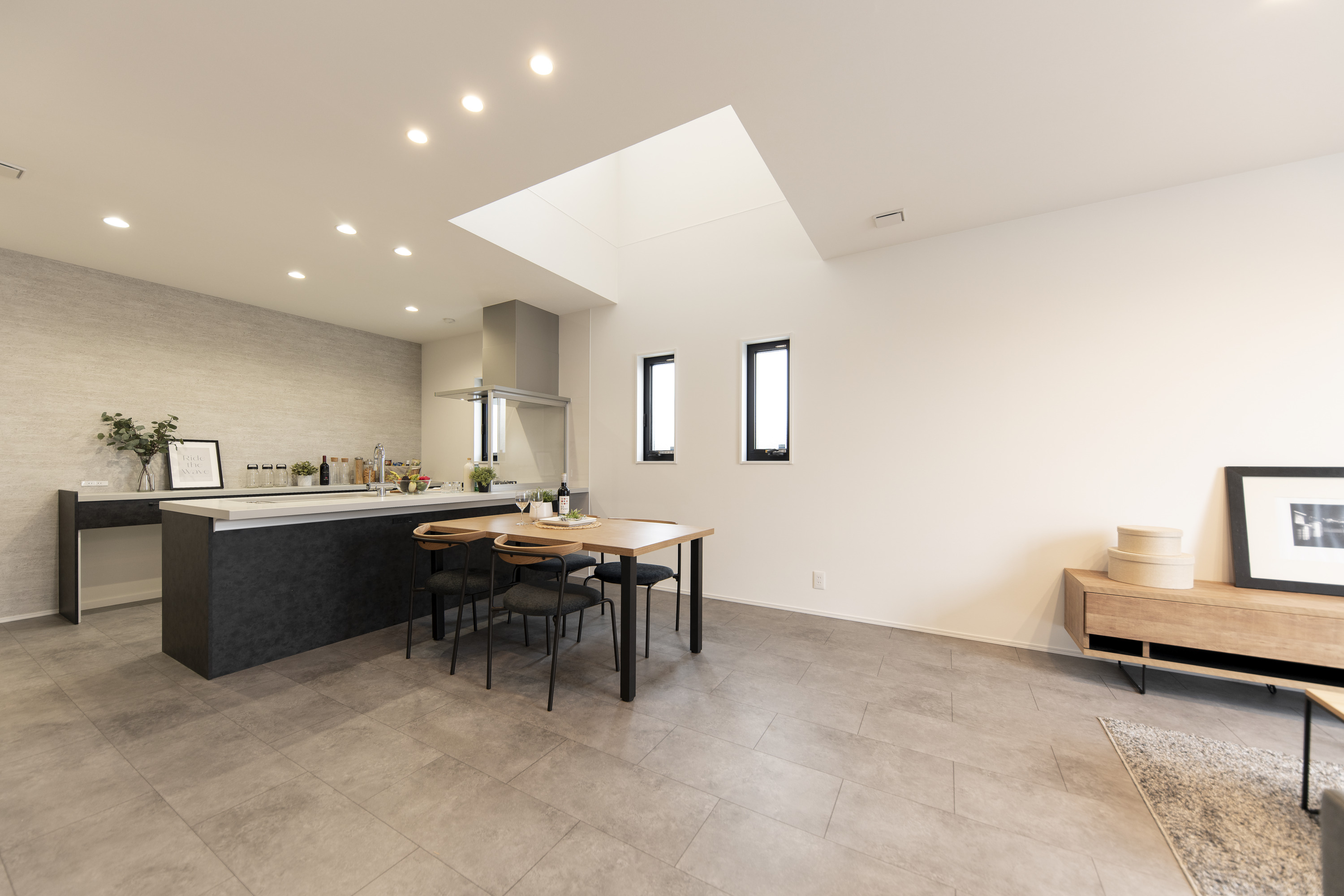 ▶ リビングは一直線に配し、たくさんの窓を設ける事で、見通し良く広く見える空間に